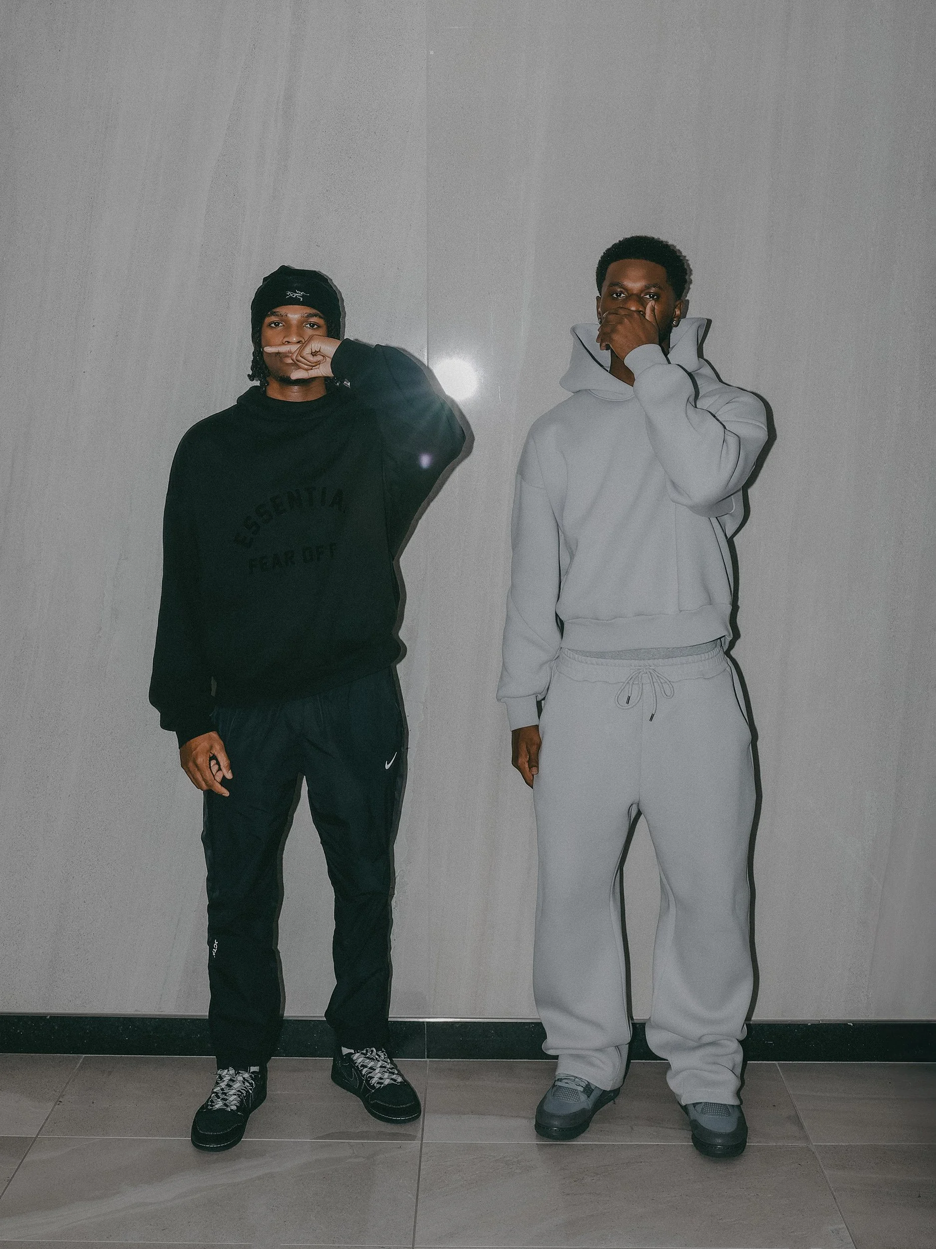 Two young men standing against a plain wall, both wearing casual streetwear, with third eye covers over their noses. One in black hoodie and black pants, the other in light gray hoodie and matching sweatpants.
